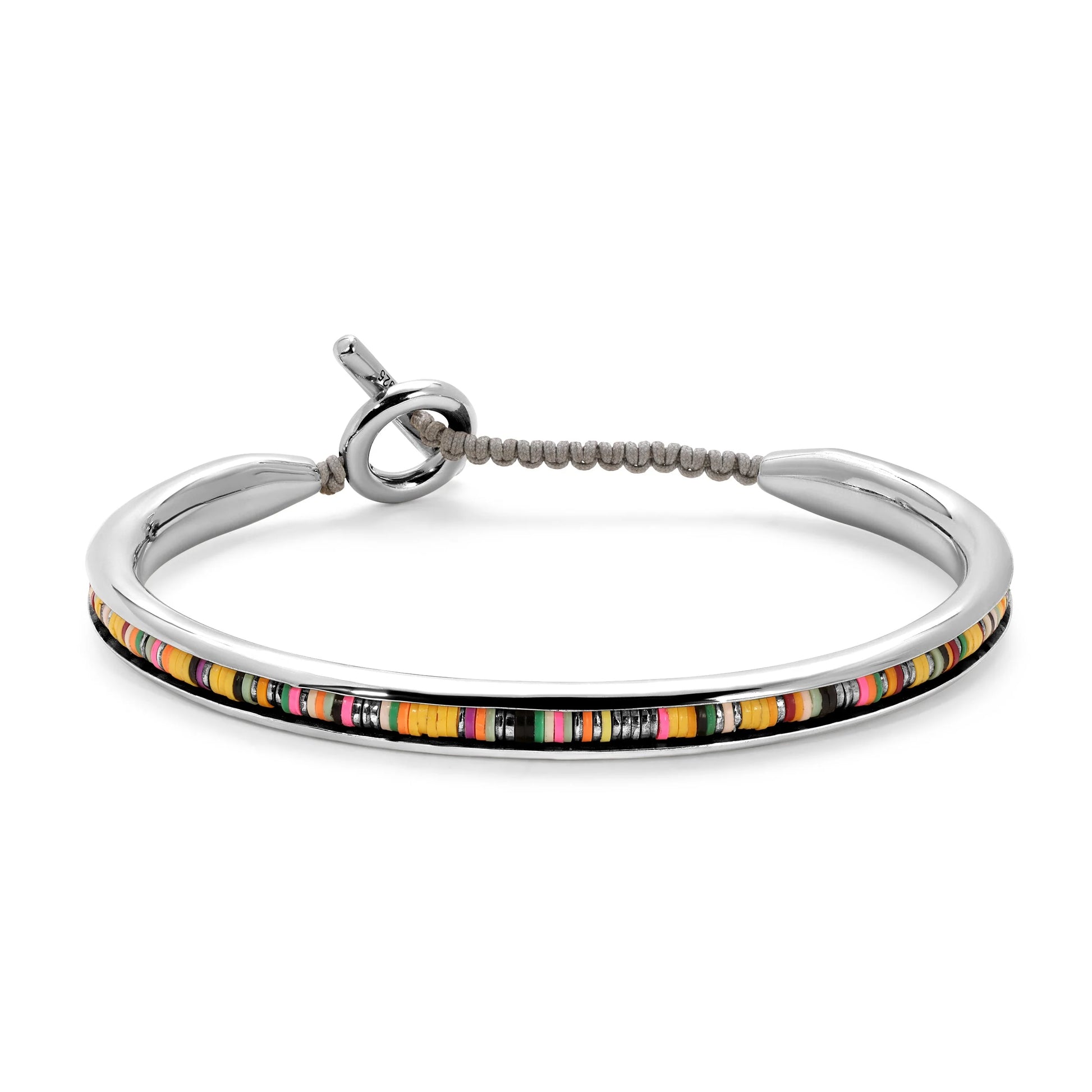 The Tunal Round Cuff in a vibrant yellow pattern is a timeless accessory that effortlessly adds a pop of color to any outfit. It is crafted from high-quality 925 silver and adorned with eye-catching African trade beads.