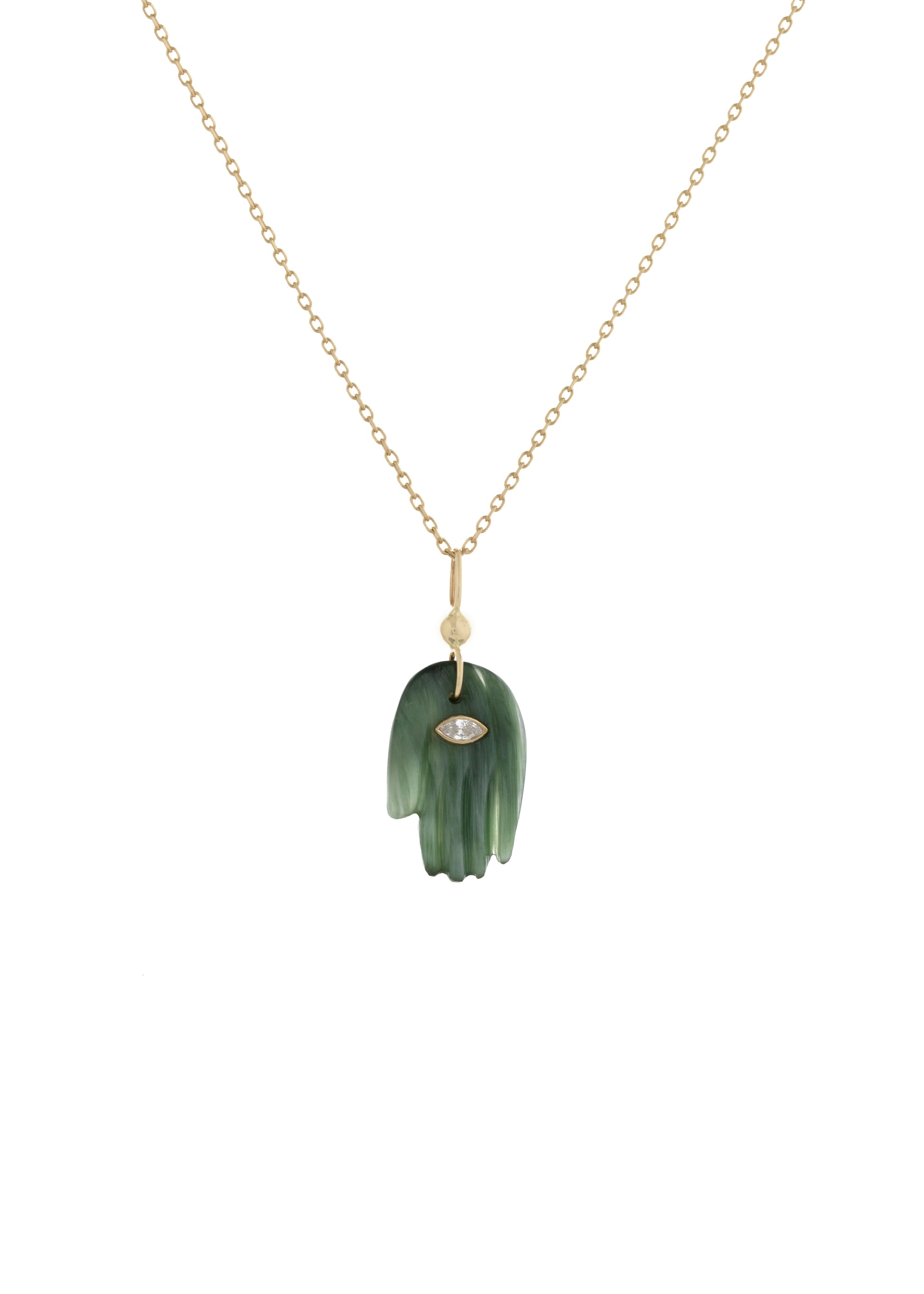 Cat's Eye Mudra's Hand & Diamond Eye Necklace from Celine Daoust is made of 14K Light Yellow Gold Cat's Eye and Diamond. Each piece is carved by hand and all will be slightly different.