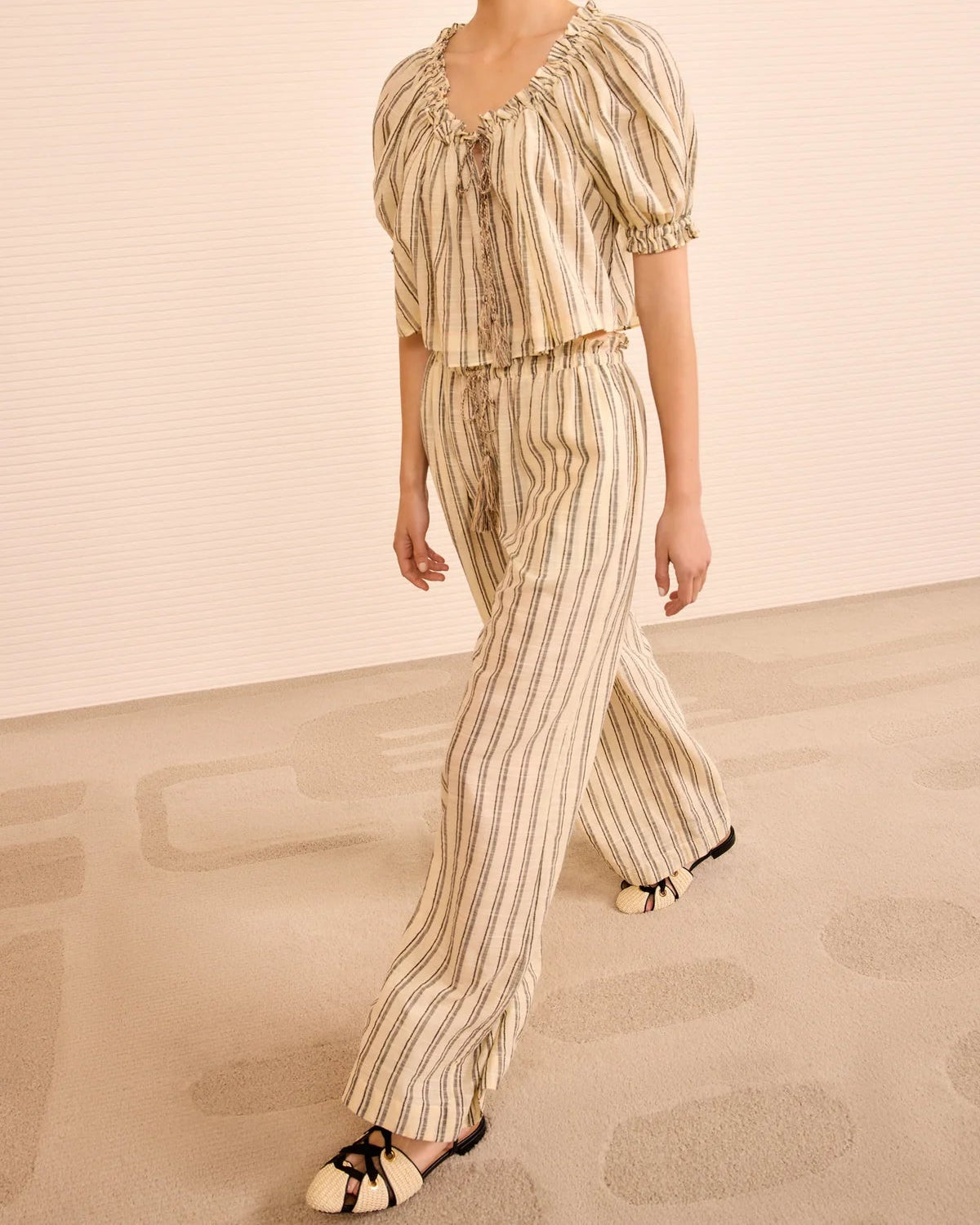 The Ulla Johnson Paros Striped Top Coverup in Cowrie Stripe is a playful, cropped coverup designed for an oversized fit. It is made from 100% hand-loomed cotton with multihued yarns creating graphic stripes. The pullover-style top features tasseled neckties and short sleeves finished with elastic cuffs.