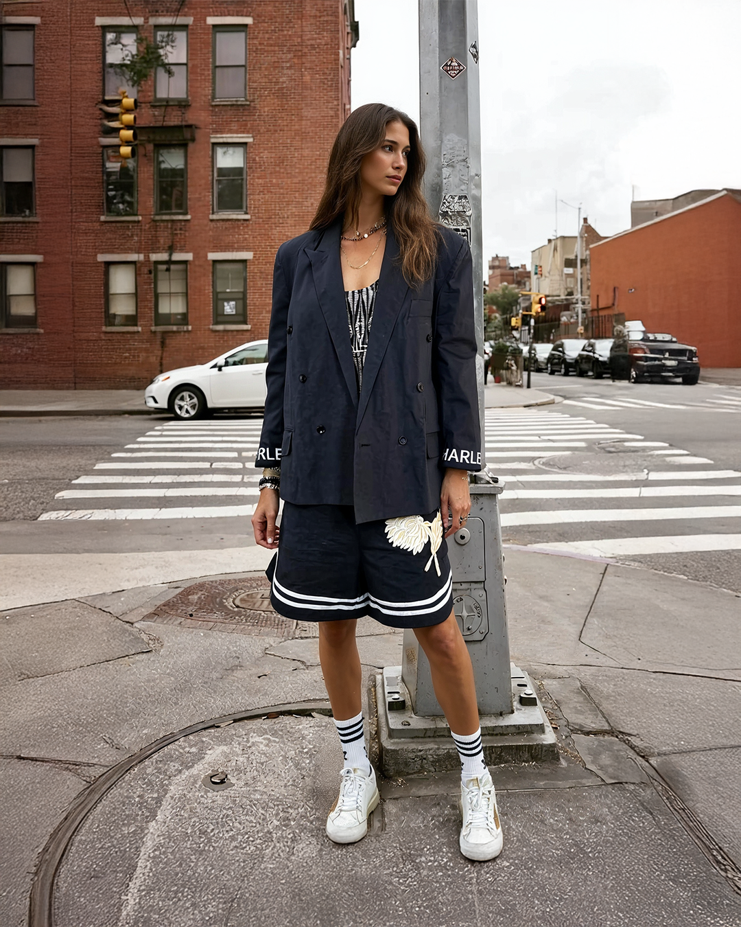 The Voyage 102 Hip Hop Shorts elevate athletic leisurewear with a striking blend of comfort and bespoke detail. Designed in Jet Black, these shorts feature a relaxed, comfortable fit with an adjustable drawstring waist, perfectly balancing style and ease. The athletic appeal is highlighted by a pair of contrasting white stripe accents sweeping along the curved hem, while the look is instantly modernized by a beautifully detailed, large-scale Dahlia embroidery.