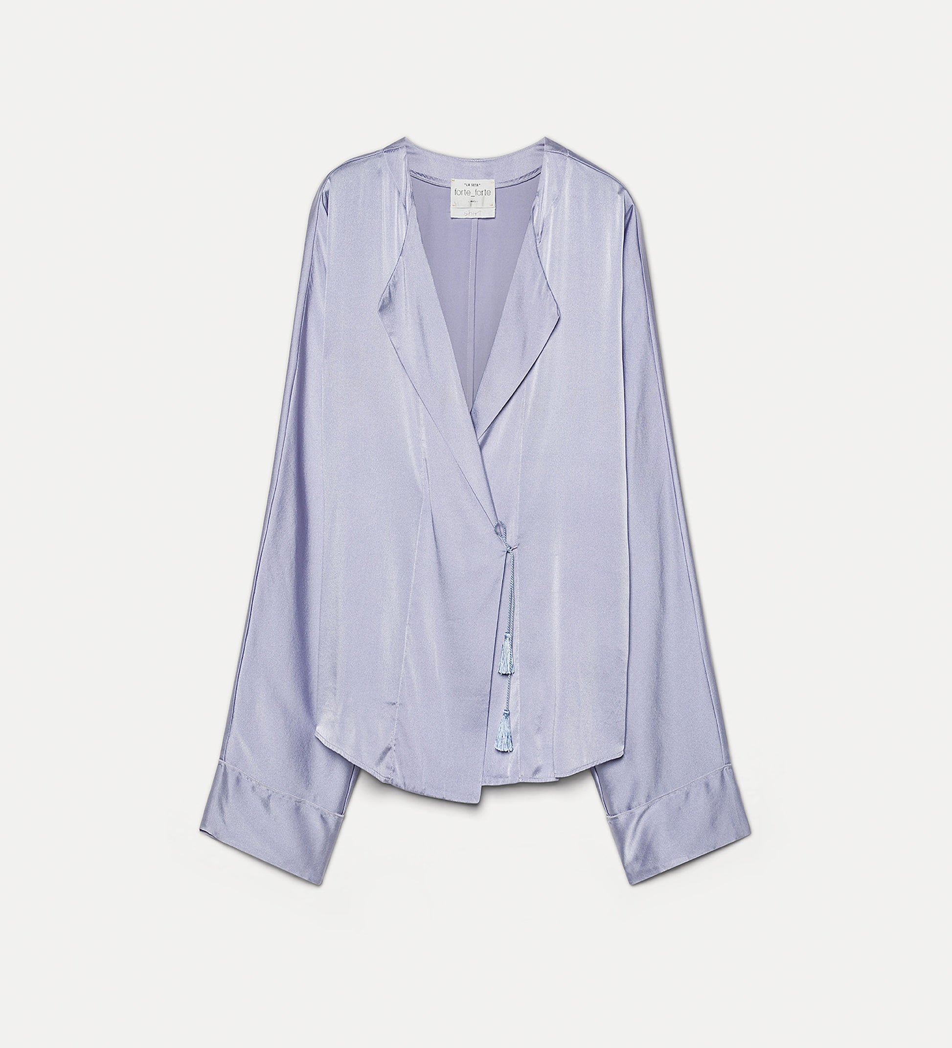 Wrap Silk–Satin Shirt, a shimmering piece that combines fluid draping with understated luxury. This shirt is crafted from a sumptuously soft silk satin, known for its lustrous finish and exceptionally smooth handle. The elegant "Lilac" hue adds a touch of ethereal charm, catching the light with every move. Its distinctive wrap-around design creates a flattering V-neckline and a cinched waist, offering a versatile silhouette that can be adjusted for a personalized fit. Featuring long sleeves with delicate cuffs and a clean, minimalist construction, this shirt is an ideal choice for transitioning from a polished office look to a sophisticated evening ensemble. The Wrap Silk–Satin shirt is a quintessential example of forte_forte's ability to blend timeless femininity with modern, effortless style.