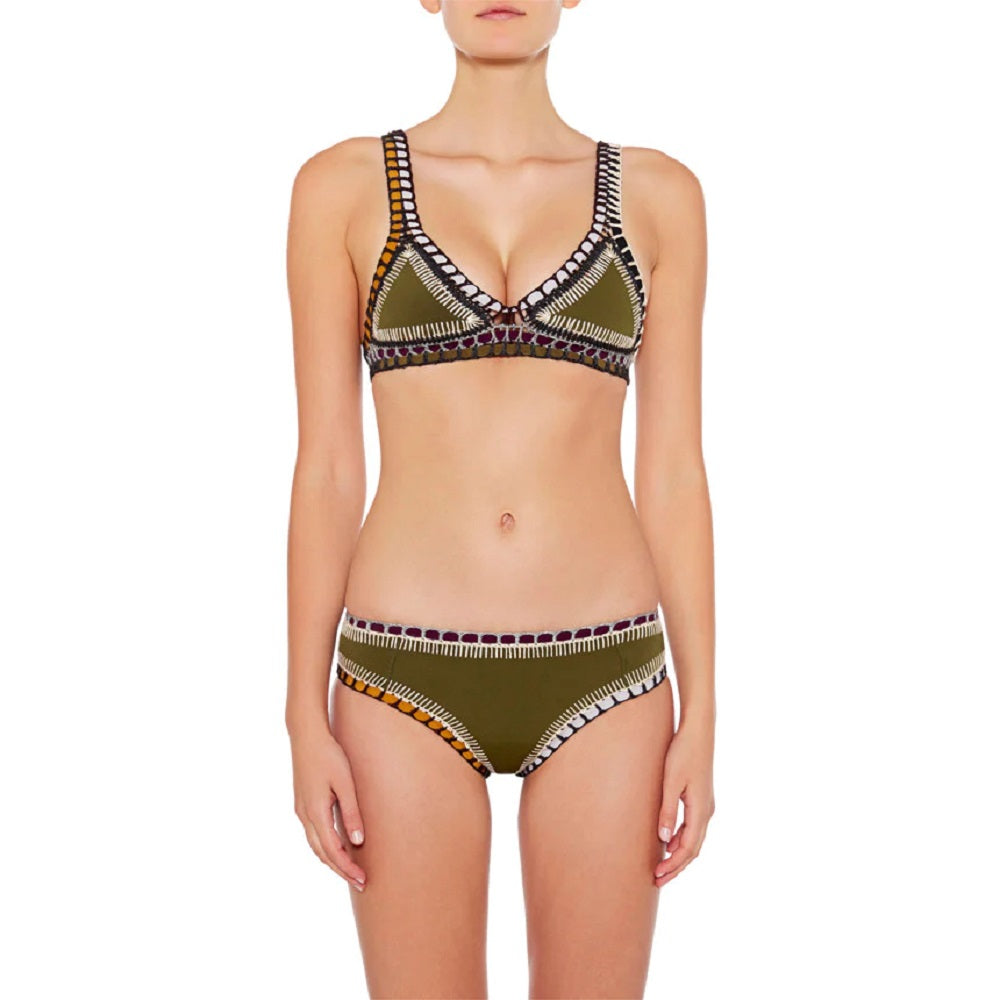 Wren Boyshort Bottom from Kiini is in olive green with multi-color crochet & elastic trim. It is made of poly/spandex, cotton & elastic.