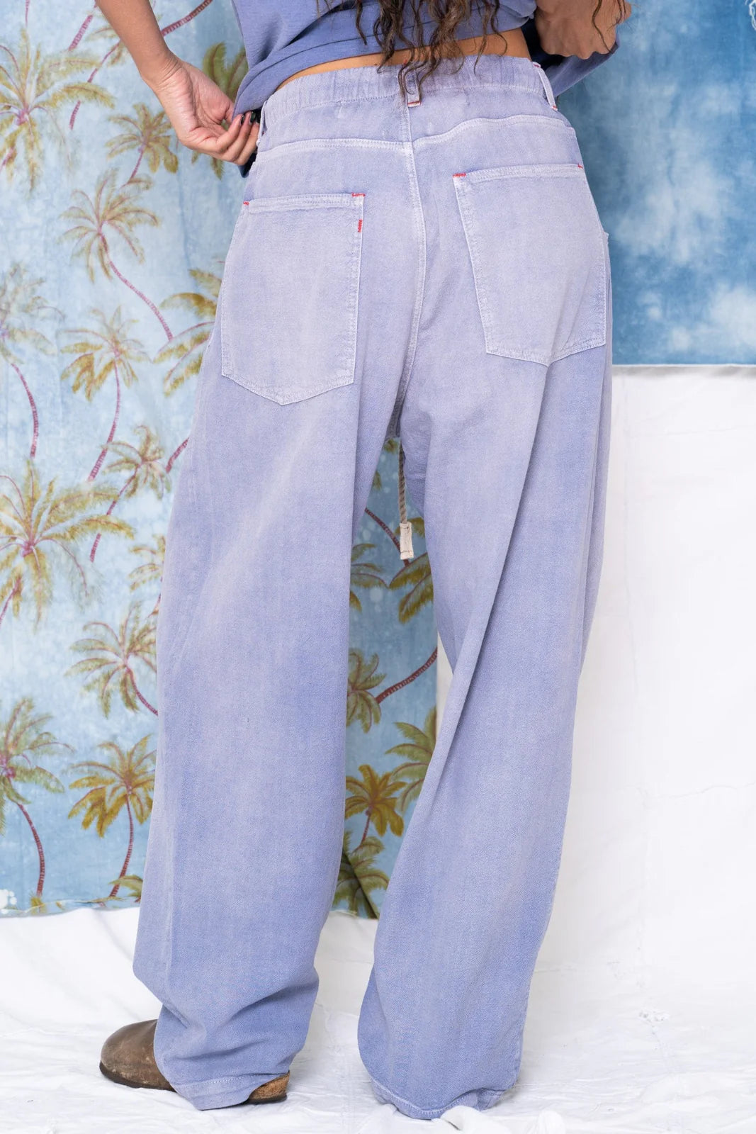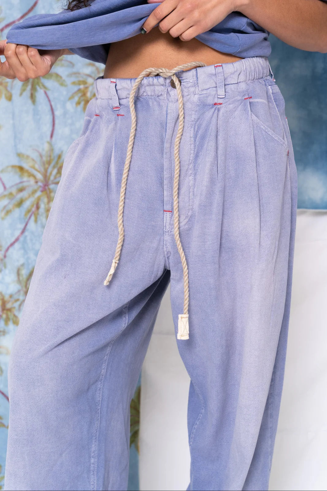 Finished with an elastic waistband, hemp twill self-tie belt, contrast bartack stitching, coconut shell button fly, and functional front and rear pockets.